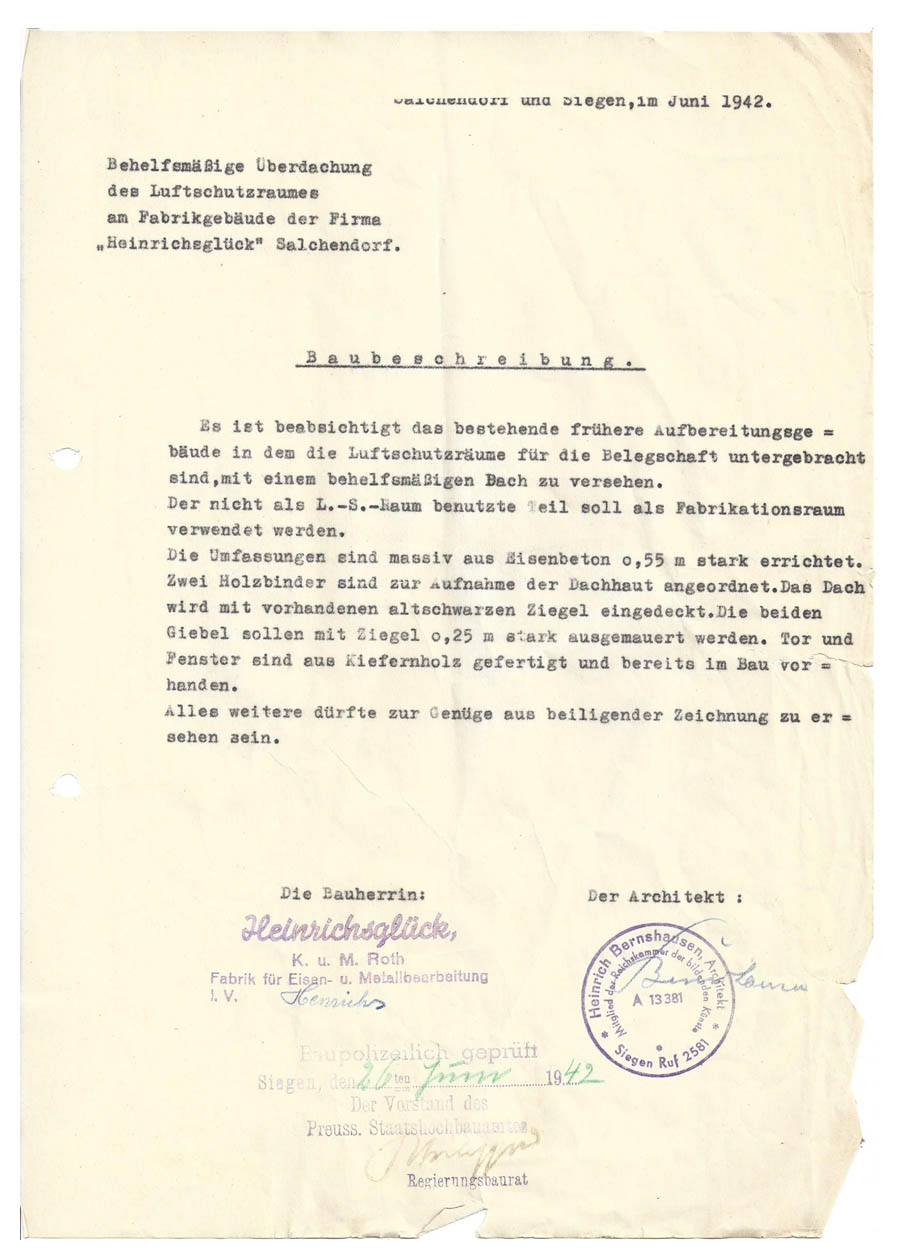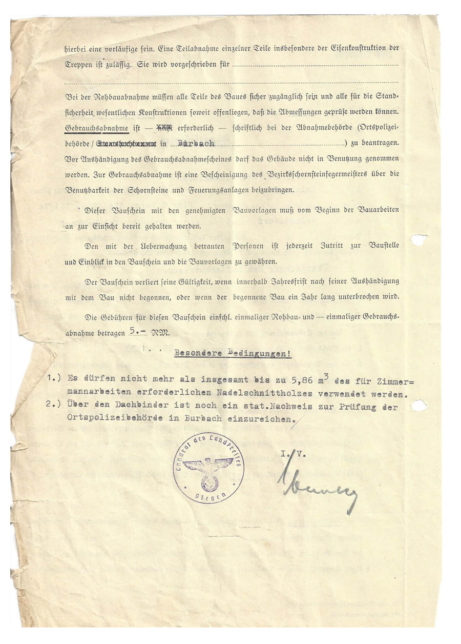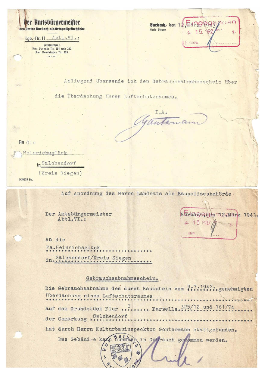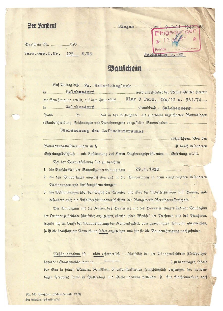 Original-Baugenehmigung von 1943 zur Überdachung des Luftschutzkellers. Abgesehen von einigen fehlgeleiteten Bomben, die auf der Kuppe des Hardtwalds eingeschlagen sind, gab es keine direkten Einwirkungen durch den Bombenkrieg.