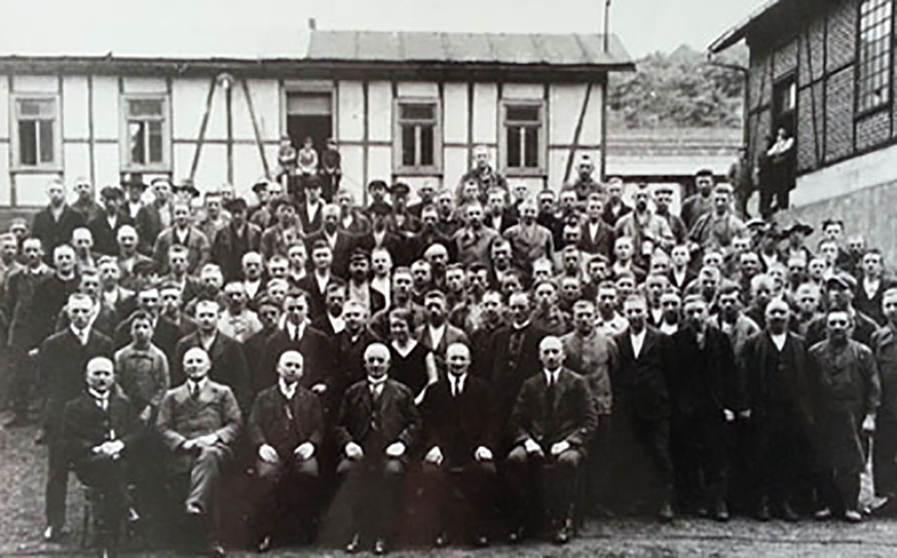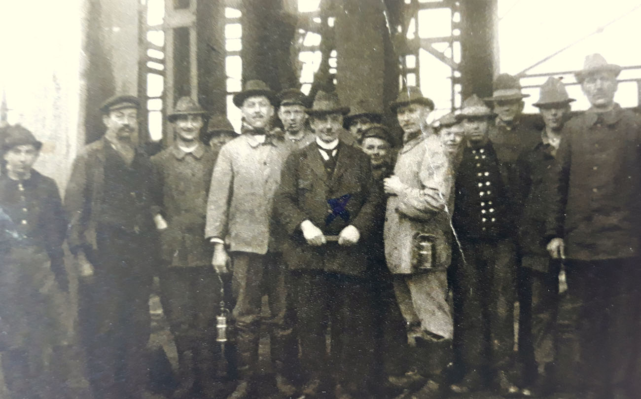 Teil der Belegschaft aus den 20igern mit Bergwerksdirektor in der Bildmitte flankiert von Steiger und Obersteiger mit Grubenlampen in den Händen.