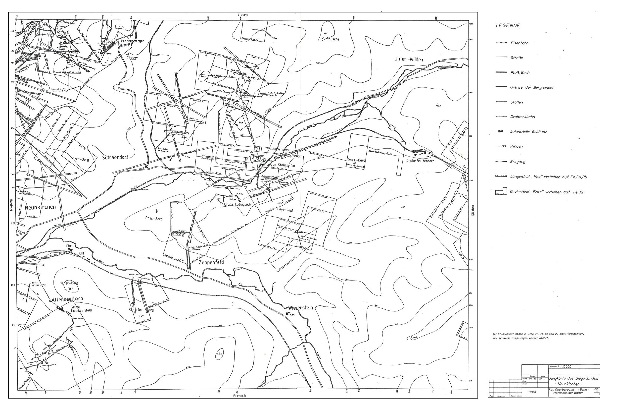 Übersicht der den jeweiligen Gruben zugehörigen Grubenfelder sowie Stollenverläufe im Gebiet der Gemeinde Neunkirchen. In der Bildmitte befindet sich der Grubenverbund der „Gewerkschaft Heinrichsglück“ mit den Gruben Heinrichsglück im Norden und Stahlseifen weiter im Süden an der Landstraße Salchendorf - Wilden.