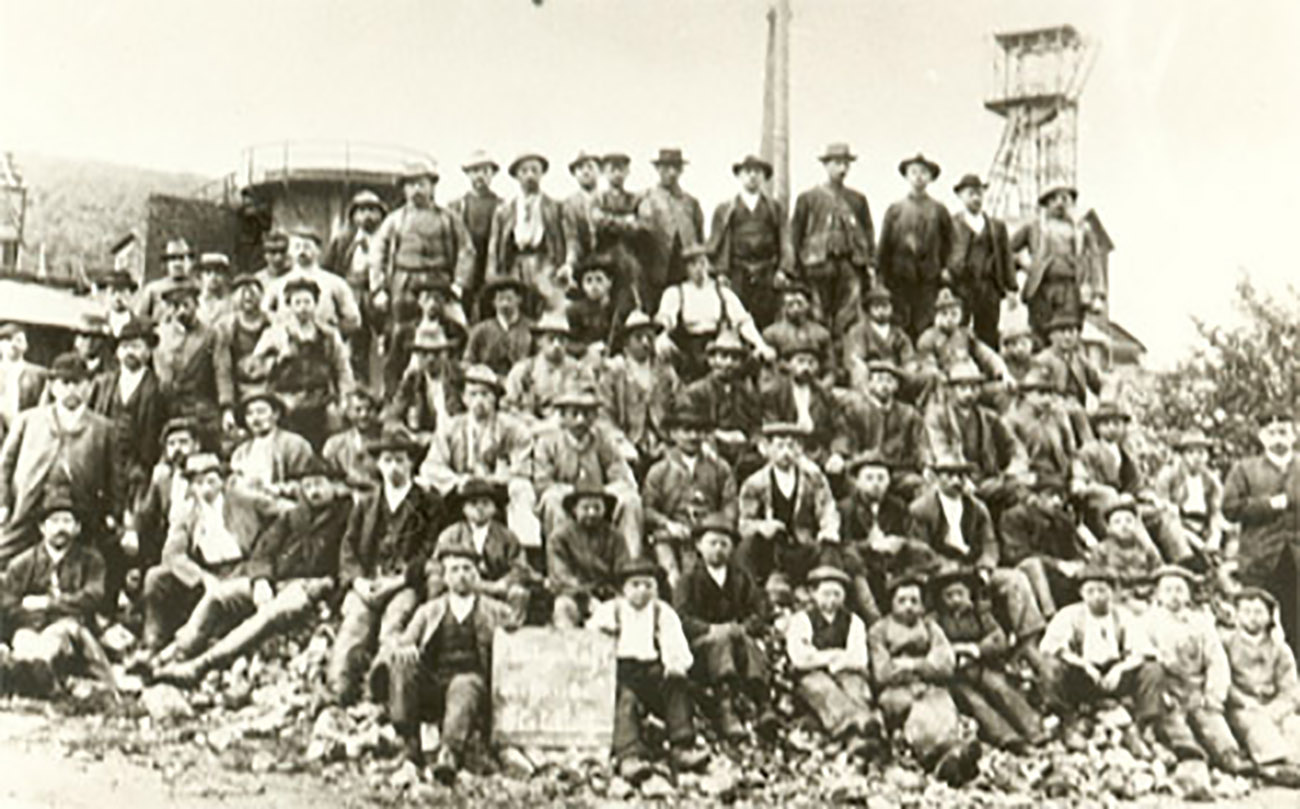 Man beachte die Hüte und Kopfbedeckungen der Arbeiter: Schutzhelme wie auch sonstige Schutzkleidung waren seinerzeit noch unbekannt. Die Bergleute mussten ihre eigene private Arbeitskleidung mitbringen.