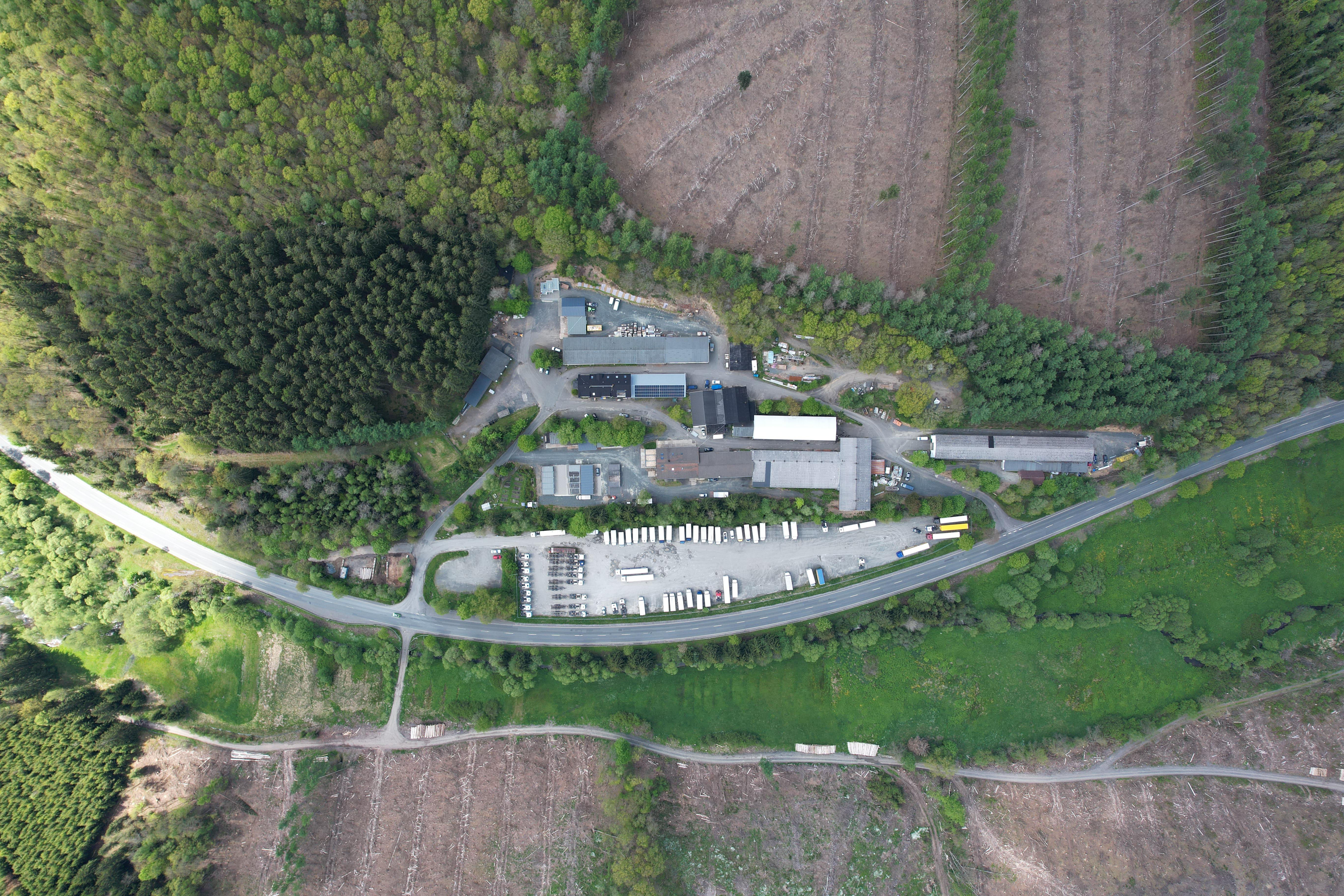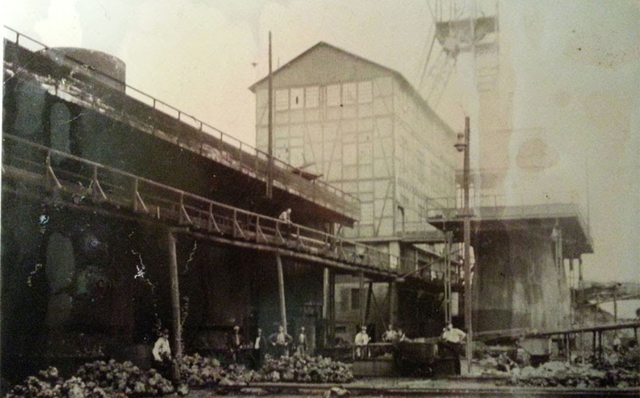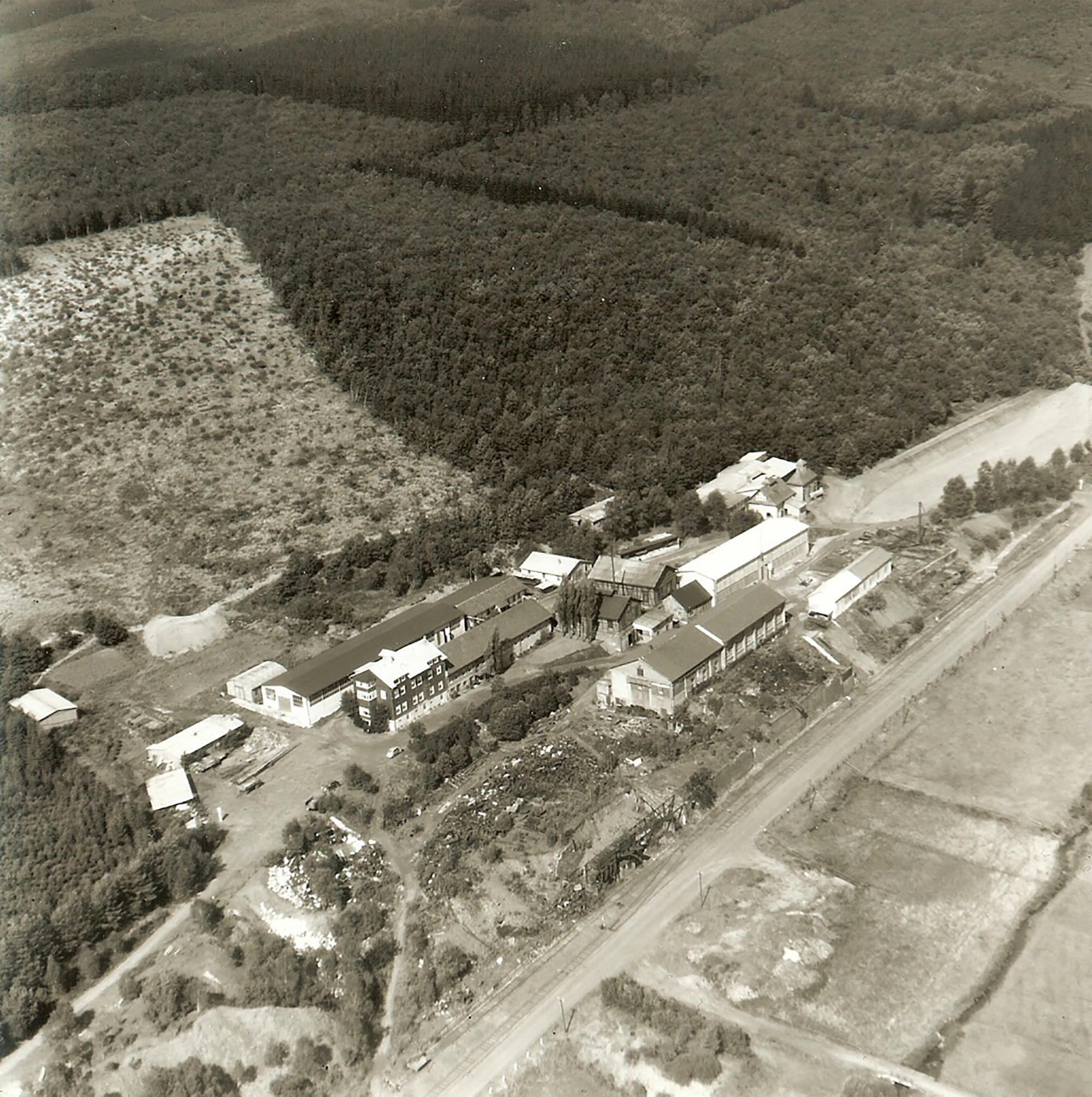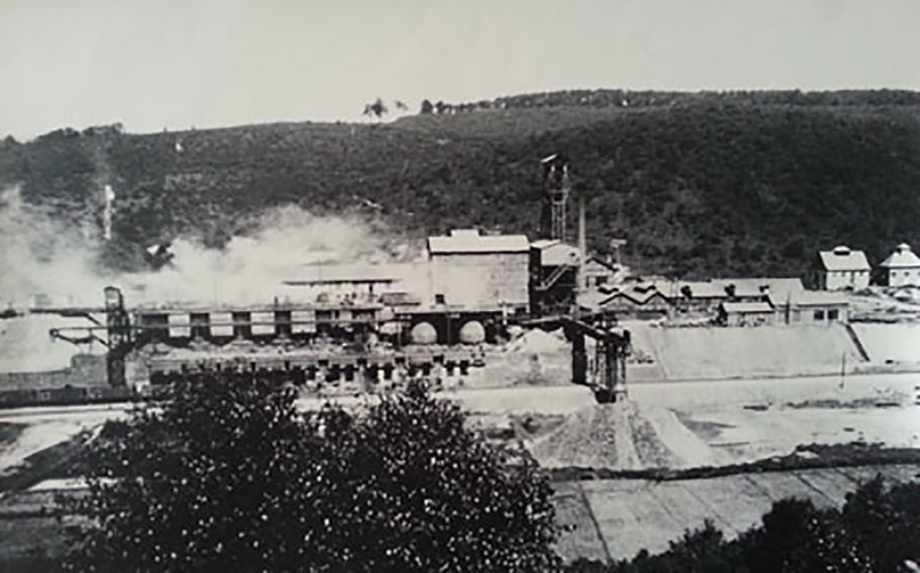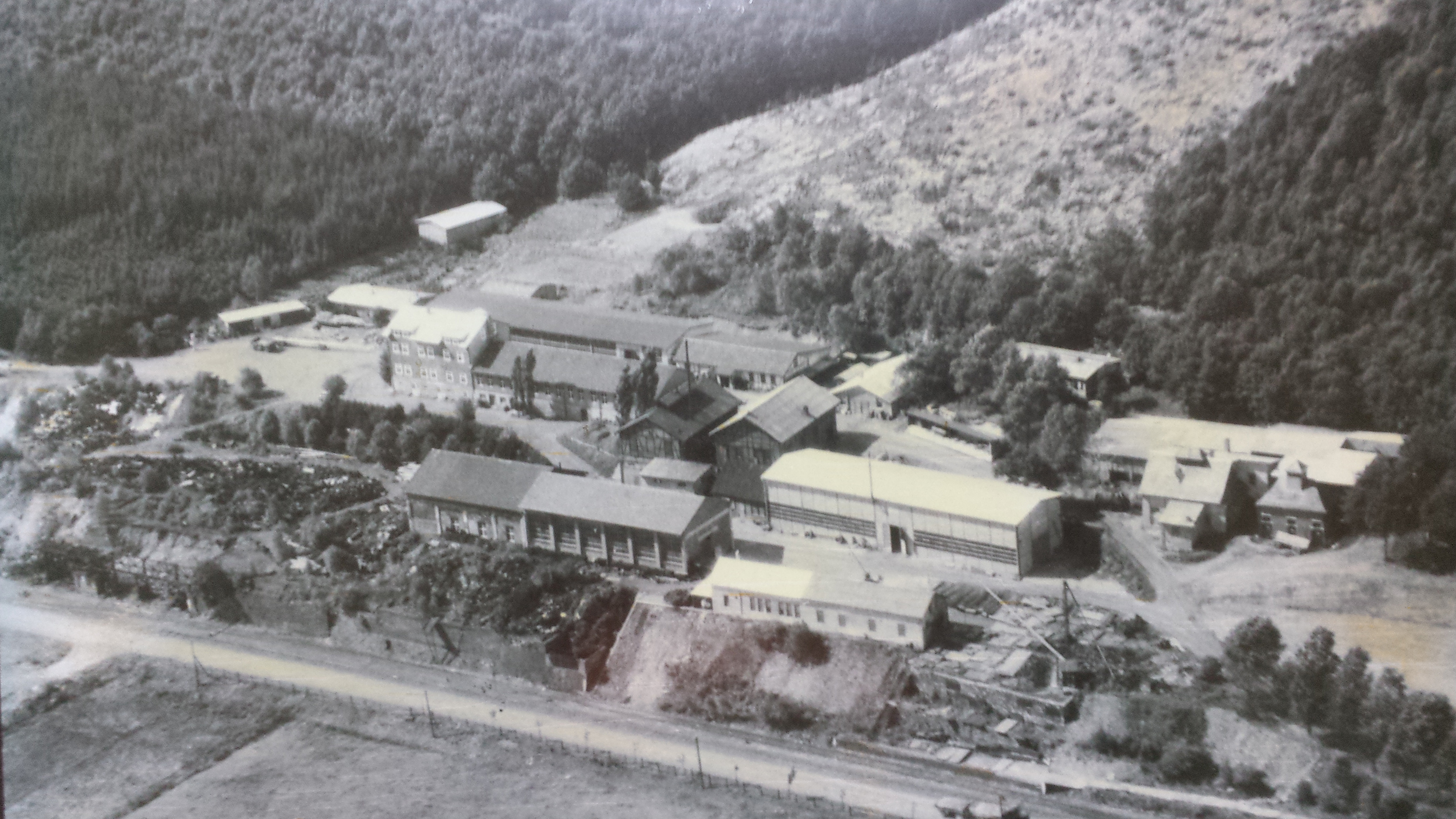 Aufnahme des Betriebsgeländes vom Wildebachtal aus, auf der die Rostöfen samt Entladevorrichtungen gut zu erkennen sind.