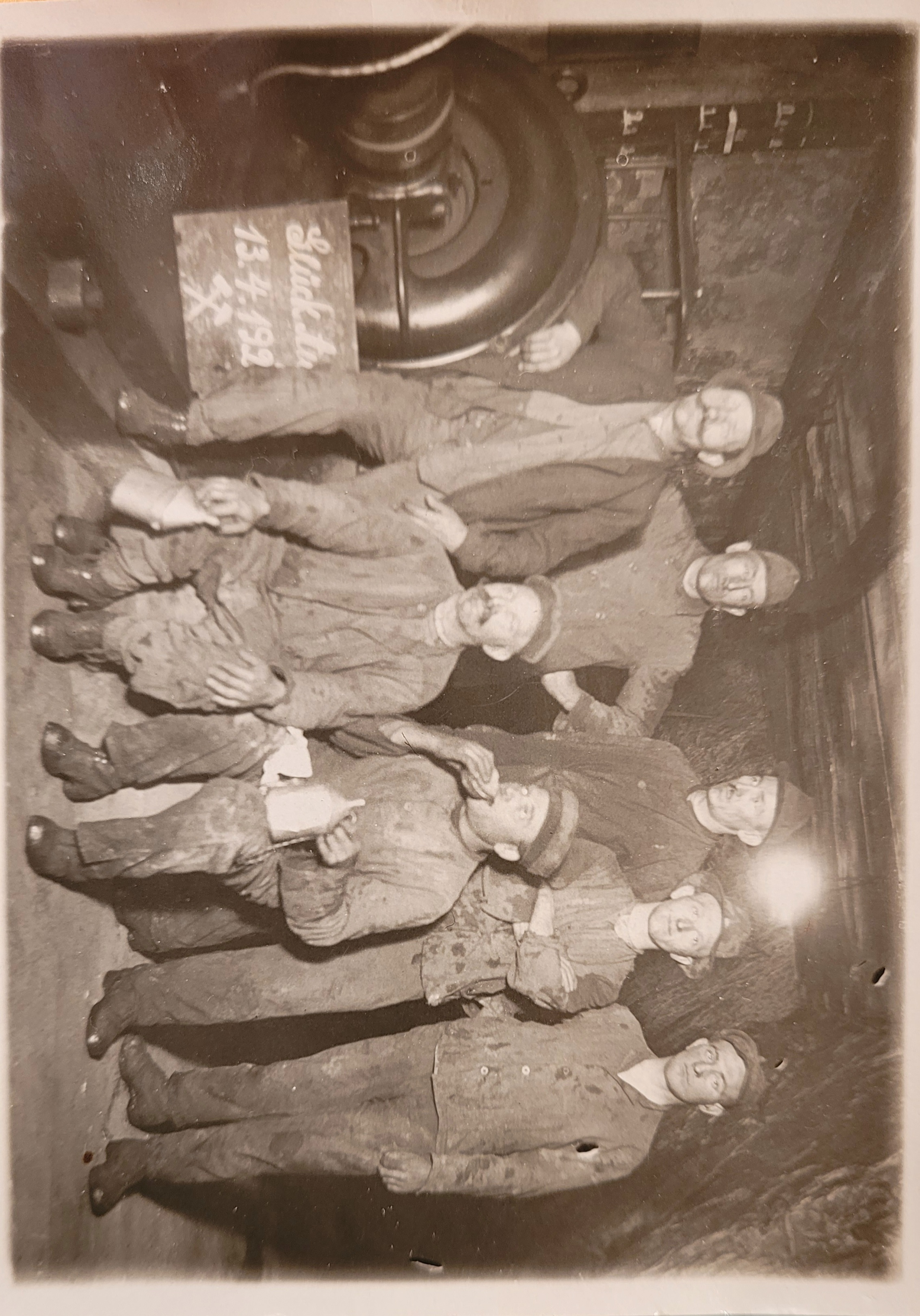 Gruppenbild mit 7 Grubenarbeitern am 13.04.1922 im Maschinenraum unter Tage. Interessant aus heutiger Sicht ist die einfache Arbeitskleidung der Arbeiter. Hinten als zweiter von links steht der Bergmann Paul Schäfer, der Großvater der heutigen Eigentümer des Gewerbegebiets.
