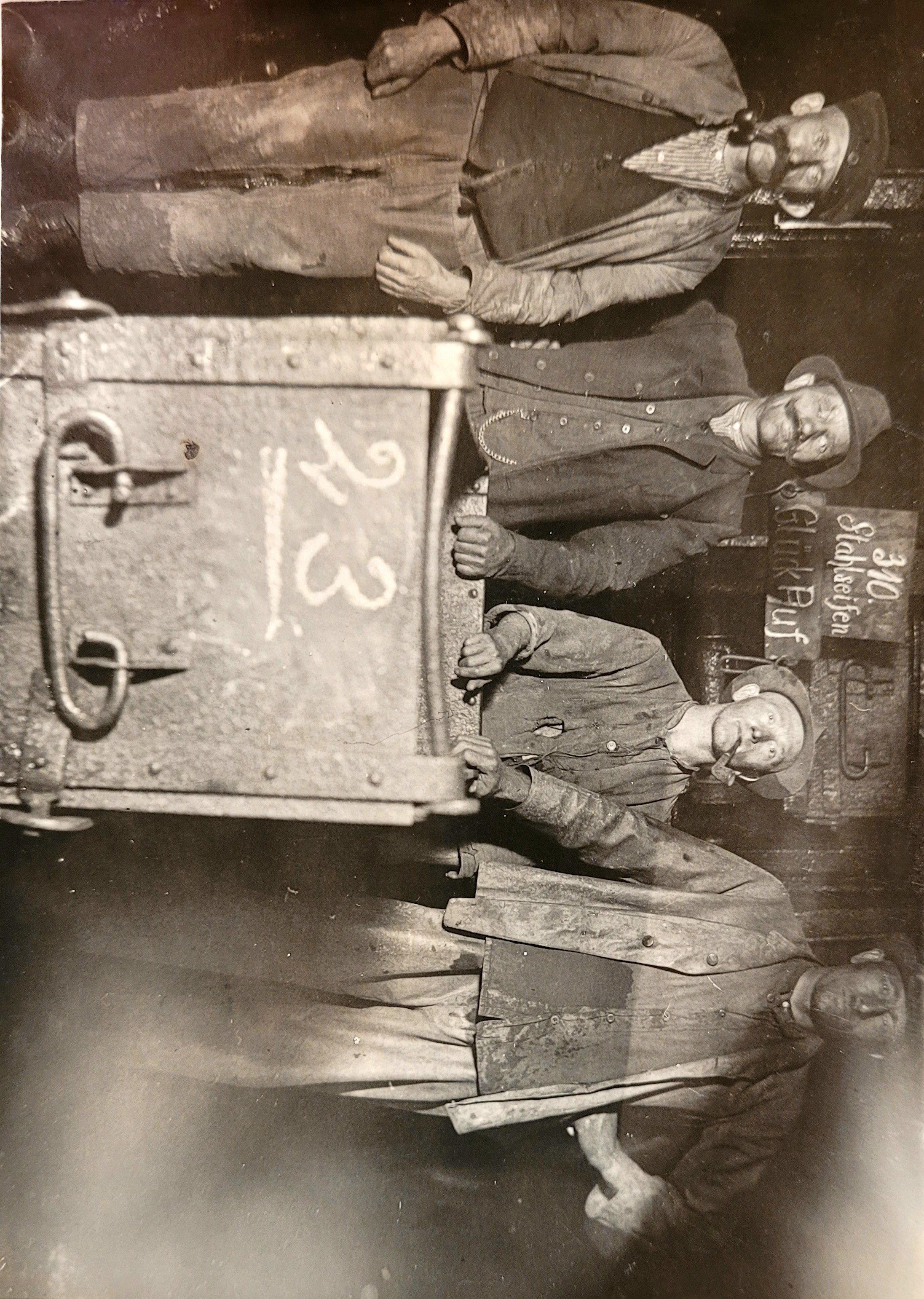 Gruppenbild mit 4 Bergleuten hinter einem Grubenhunt. Man beachte die ausdrucksstarken Gesichter der Grubenarbeiter. Ganz rechts ist wieder Paul Schäfer zu sehen, der als junger Mann einige Jahre als Hauer in der Grube tätig war. Im Hintergrund ist noch der ursprüngliche Name der Grube „Stahlseifen“ angeschrieben.