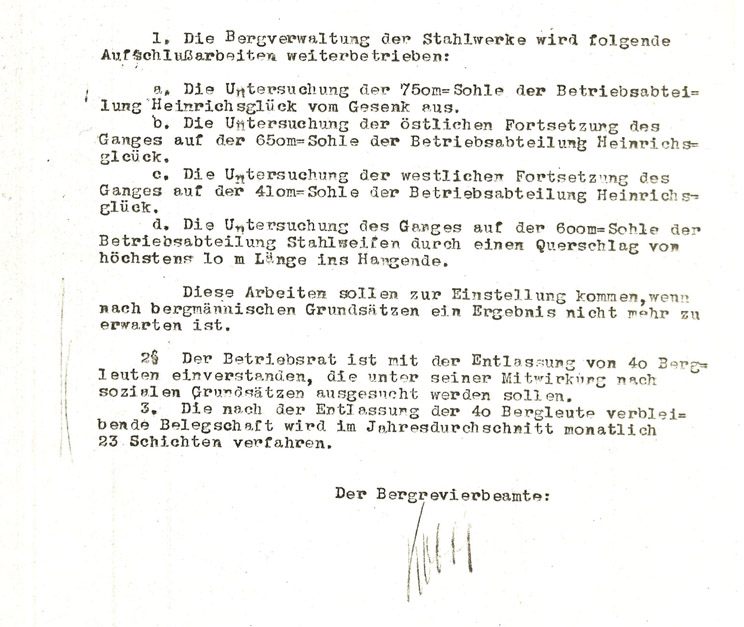 Kopie eines Verhandlungprotokolls über die Betriebseinschränkung der Grube 1934.