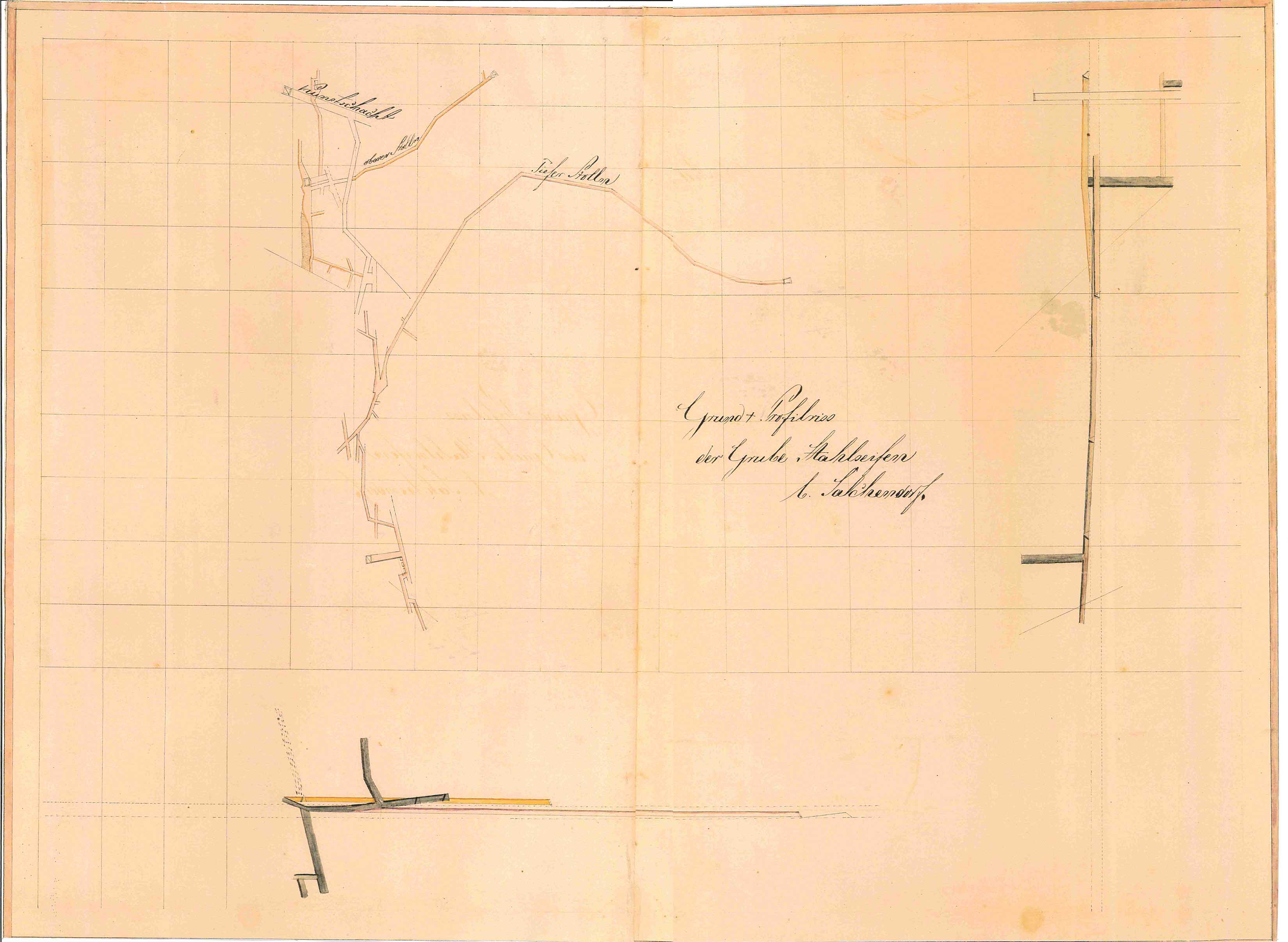 Der Grund + Profilriss der Grube zeigt den Stollen- und Schachtplan in der Aufsicht