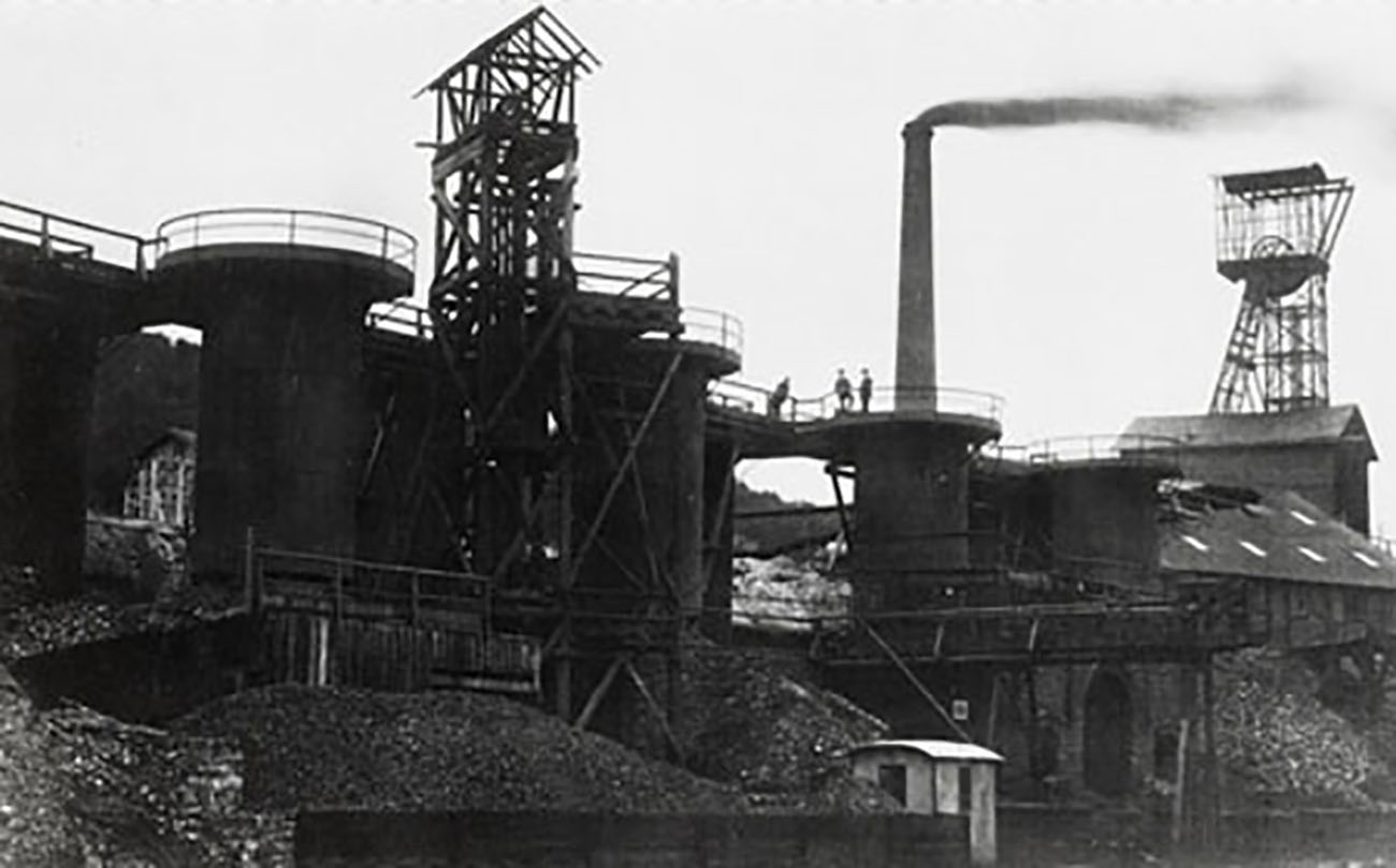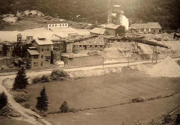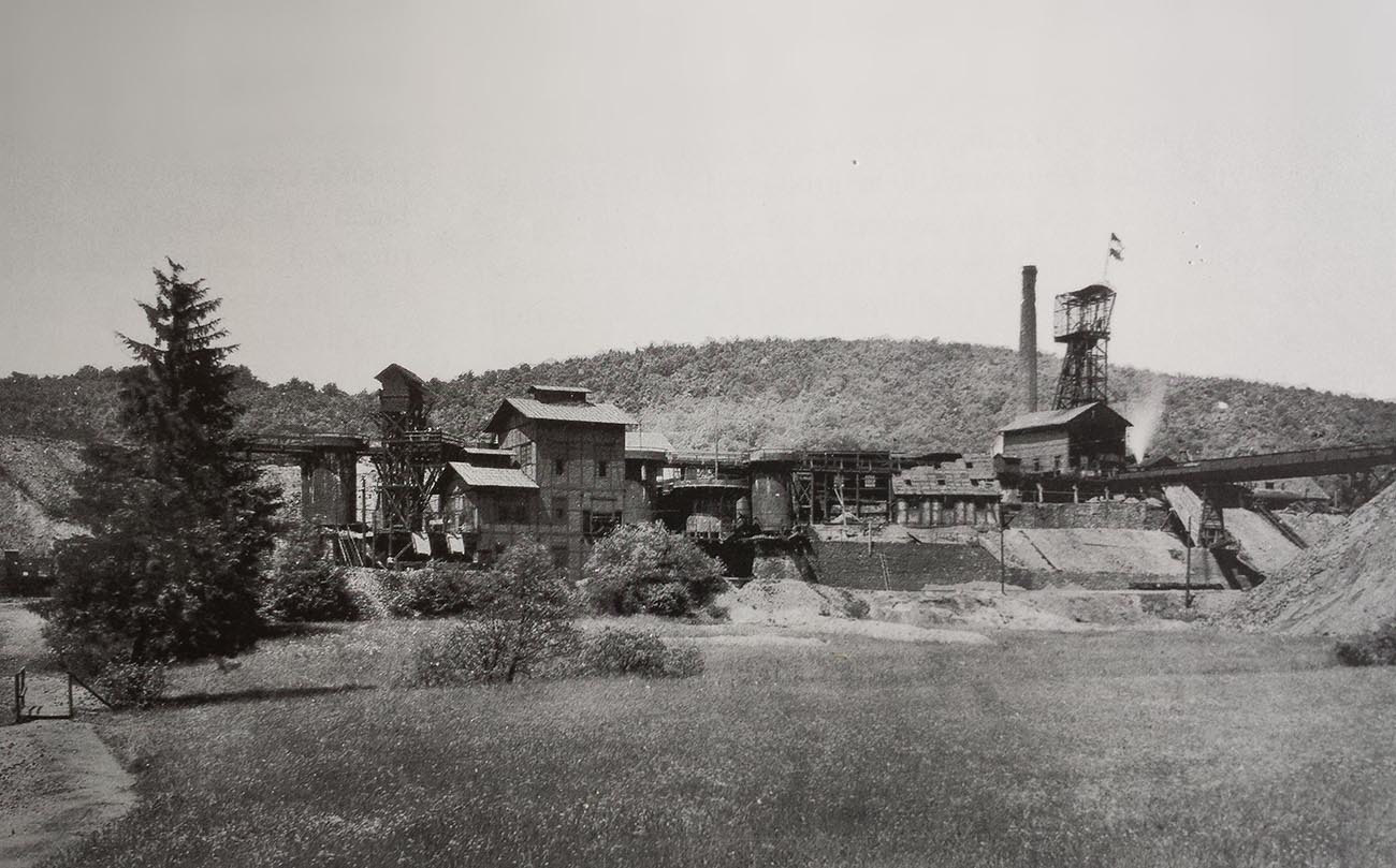 Aufnahme der oberirdischen Schachtanlagen vom Wildebach aus. Die ersten Aufbereitungsöfen sind schon installiert.