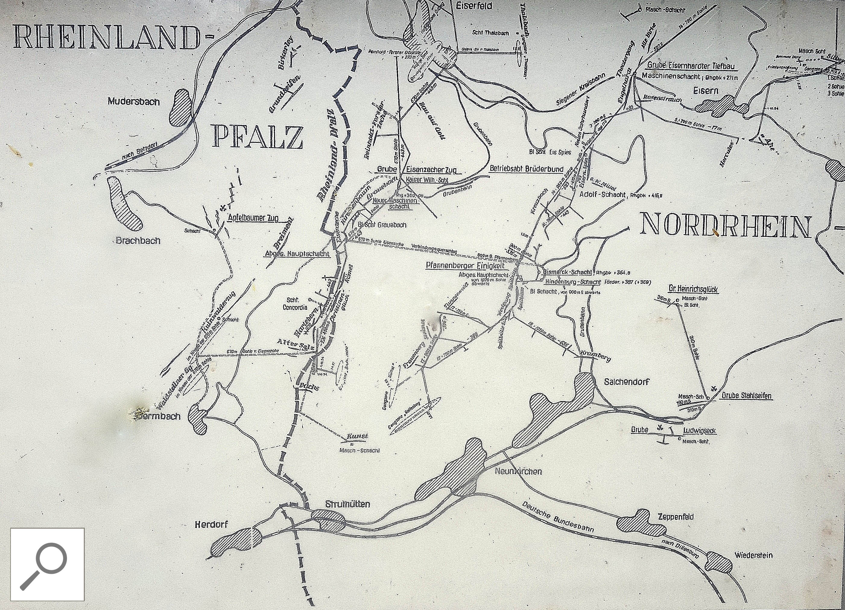 Im Zentrum des Bildes die tiefste Grube des Reviers „Pfannenberger Einigkeit“ mit Verbindungsquerschlägen zu den umgebenden Gruben Eisenzecher Zug, Brüderbund und Eisernhardter Tiefbau.