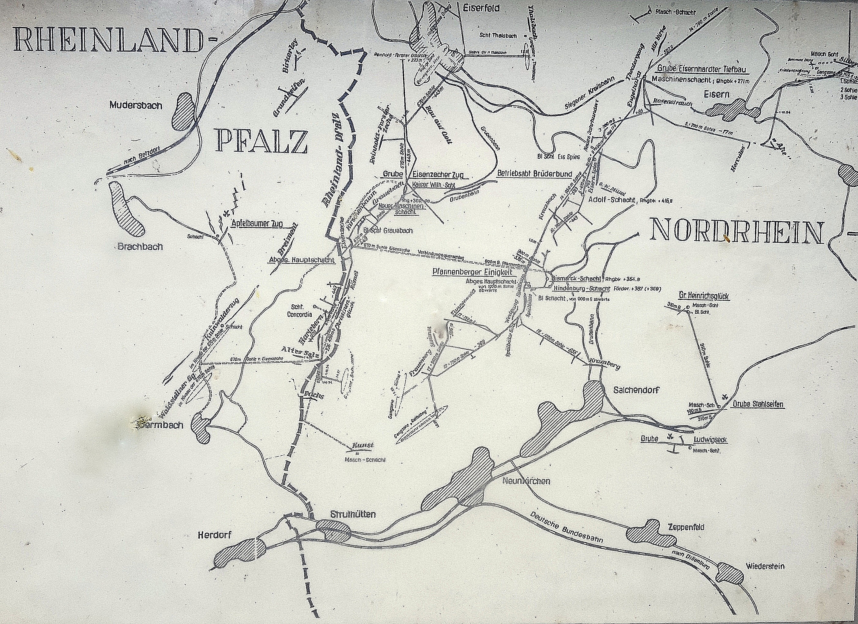 Schematische Übersichtskarte der Gruben im Erzbergbaurevier südliches Siegerland. Die Karte wurde wahrscheinlich in den 50iger/60iger Jahren erstellt und zeigt alle Gruben in ihren jeweiligen maximalen Ausbaustadien.